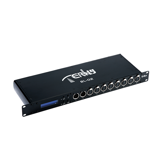 Signals are input via two ports, A and B, and can be reconfigured into DMX512 standard signal channels, arranged either as 8 individual output ports or as two groups of 4 outputs; the device also features enhanced signal amplification.
