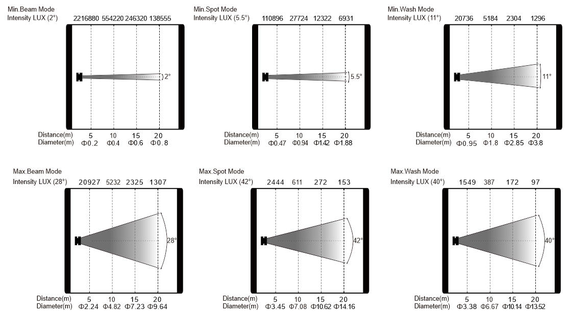 Zoom range: beam mode:2°-28°; spot mode: 5.5°-42°; wash mode: 11°-40°